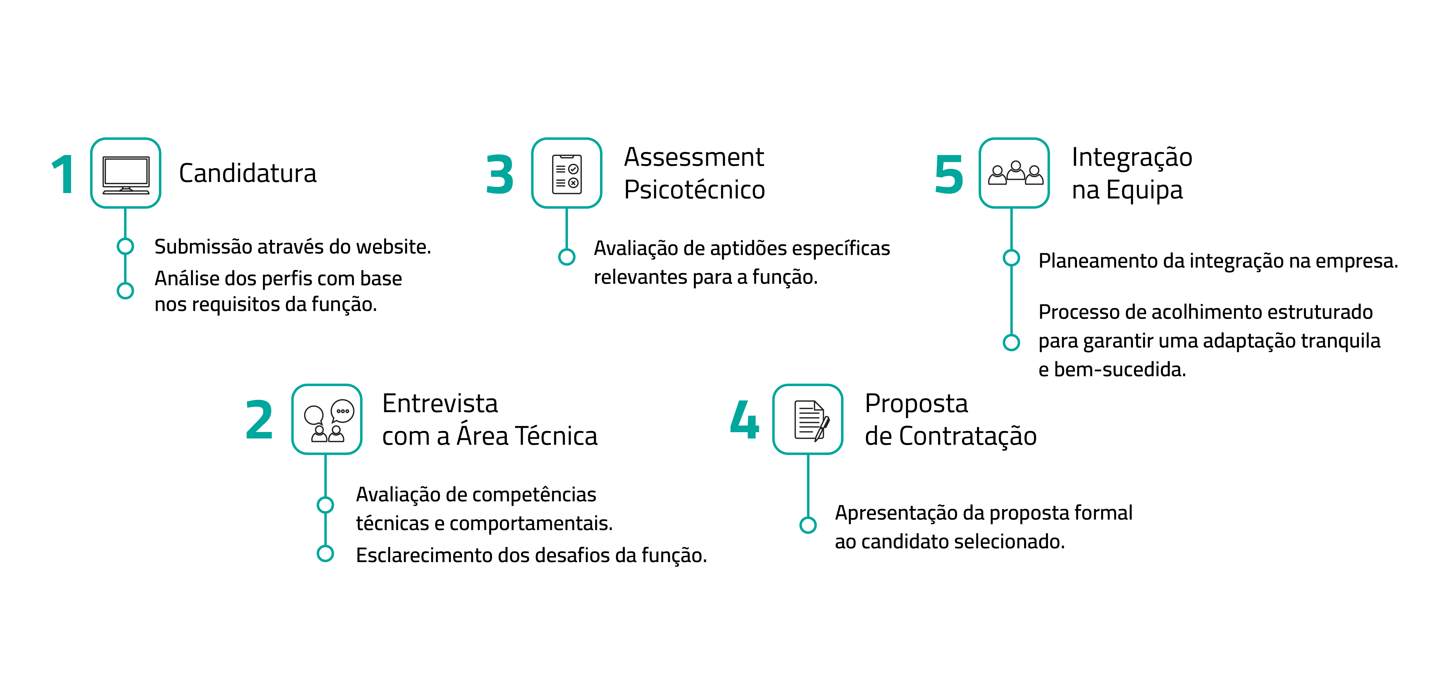 O processo tem início com a candidatura através do nosso website, onde analisamos os perfis que melhor se alinham com os requisitos da função. Se avançar para a fase seguinte, será realizada uma entrevista com os responsáveis da área, com o objetivo de avaliar competências técnicas e comportamentais, bem como esclarecer os principais desafios do cargo. Posteriormente, realizamos um assessment psicométrico para aferir aptidões específicas relevantes para a função. Em caso de seleção, apresentamos uma proposta com as condições associadas. Após a aceitação, preparamos cuidadosamente a integração, garantindo um acolhimento estruturado que assegure uma transição tranquila e bem-sucedida para a nova equipa.