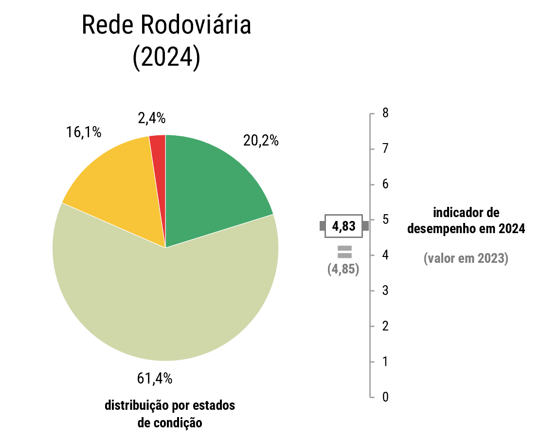 Para os grupos de ativos considerados, regista-se uma ligeira melhoria do indicador nas obras de arte (5,27 em 2023 e 5,28 em 2024) e uma ligeira descida nos pavimentos (de 4,65 em 2023 para 4,63 em 2024). Em ambos os casos, é de referir a elevada percentagem de ativos no estado Bom ou Razoável (na ordem de 90% e 77%, respetivamente).
